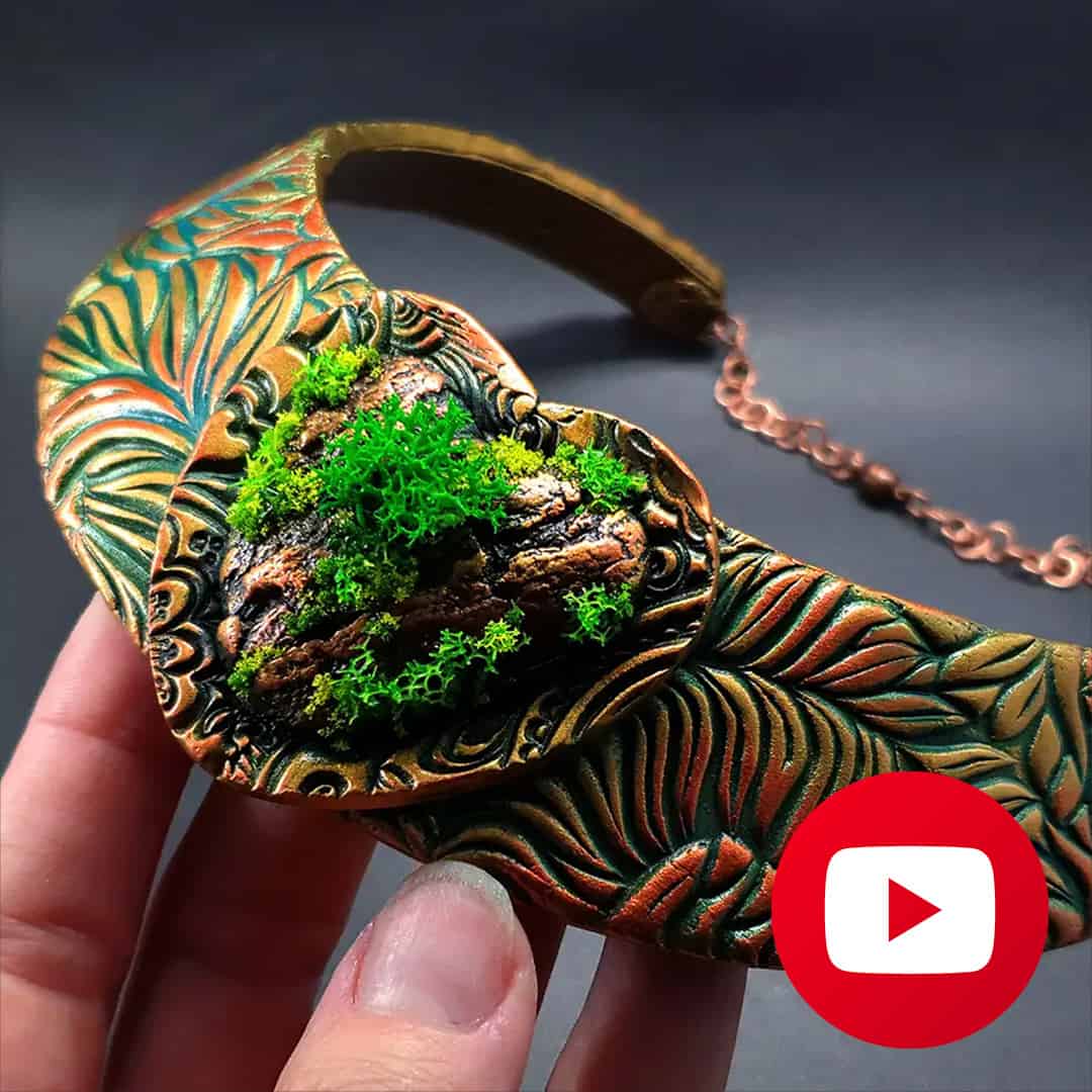 In this video tutorial I want to show you How to make polymer clay necklace with nature motives: fern, tree bark, moss.